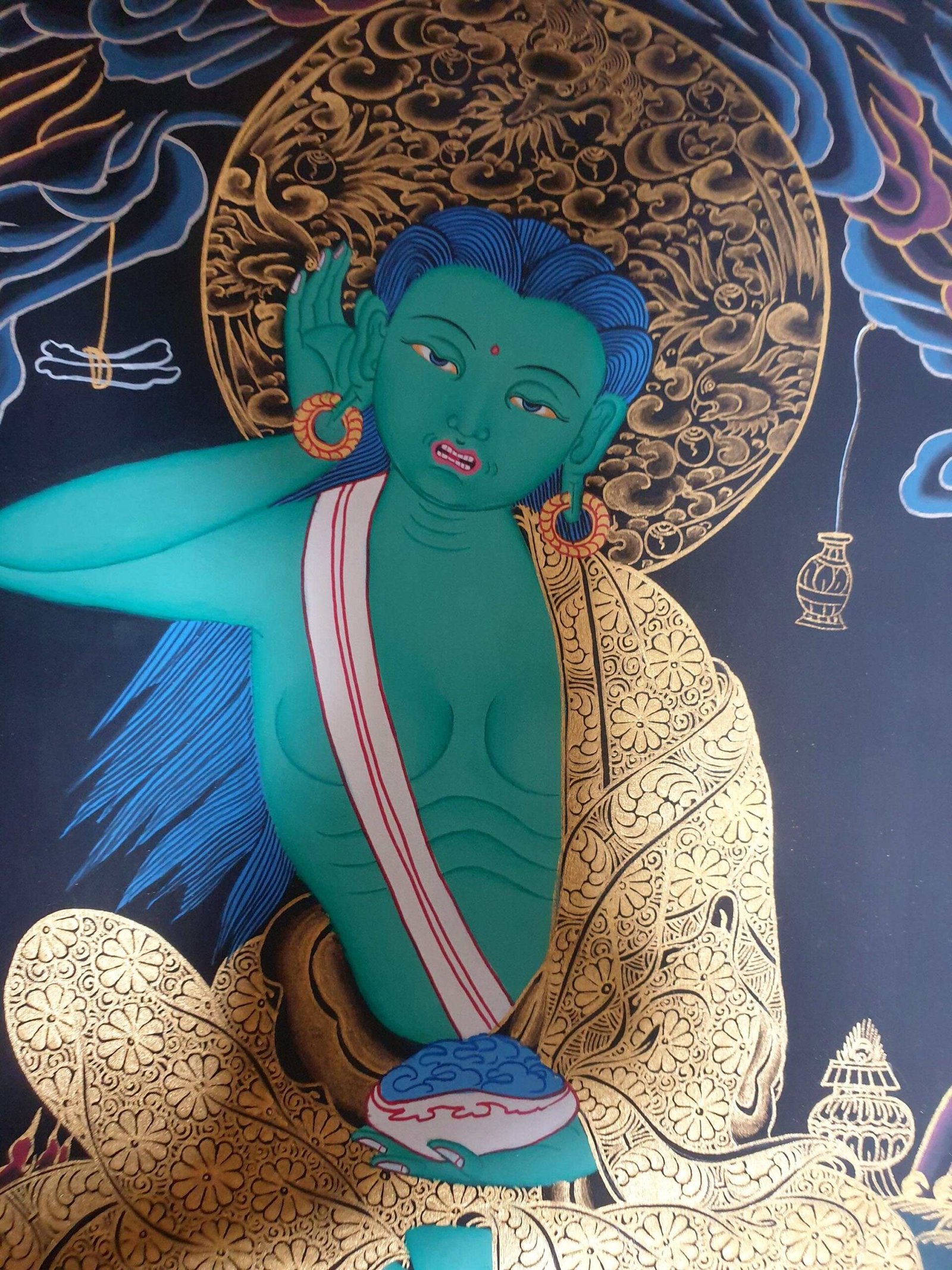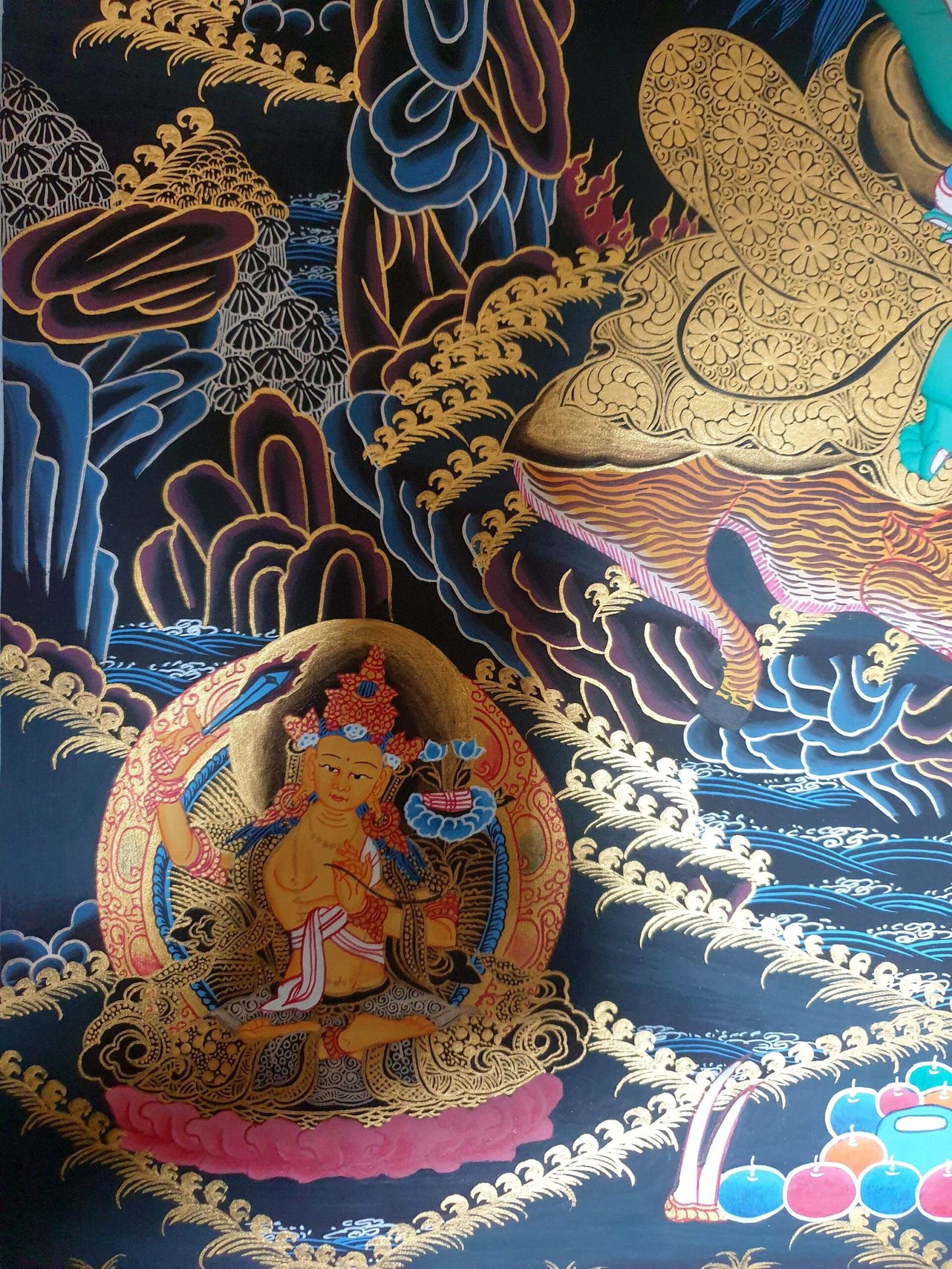 This thangka also features Manjushri and Vajrapani, enhancing its spiritual depth: