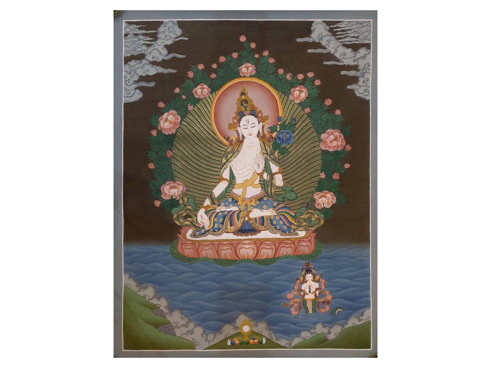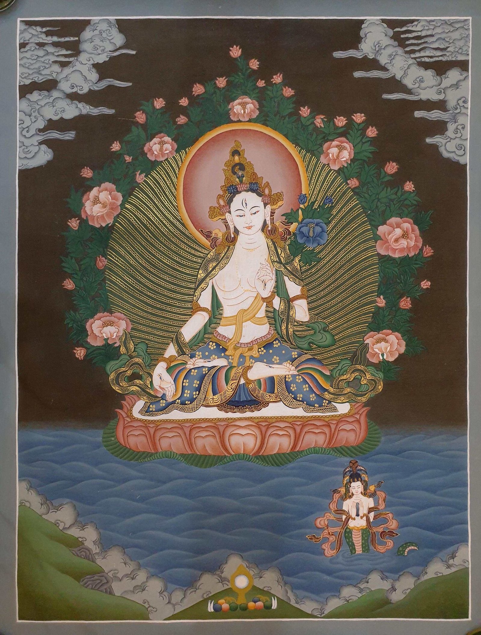 This Thangka of White Tara is not only an exquisite piece of artistry but also a profound spiritual symbol, making it ideal for meditation spaces, collections, or Buddhist practice. Its timeless beauty and sacred essence resonate with the ideals of peace, longevity, and compassion.
