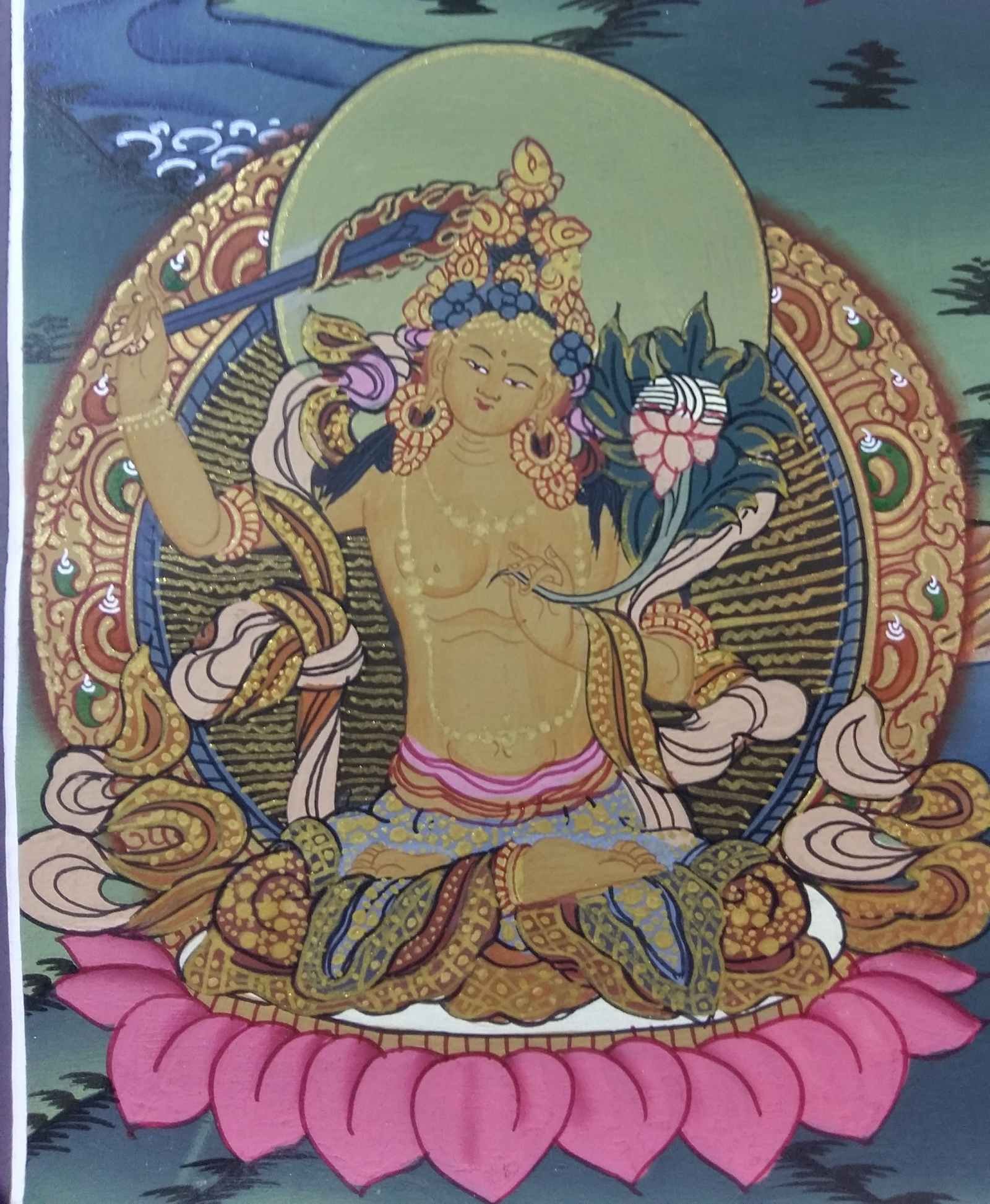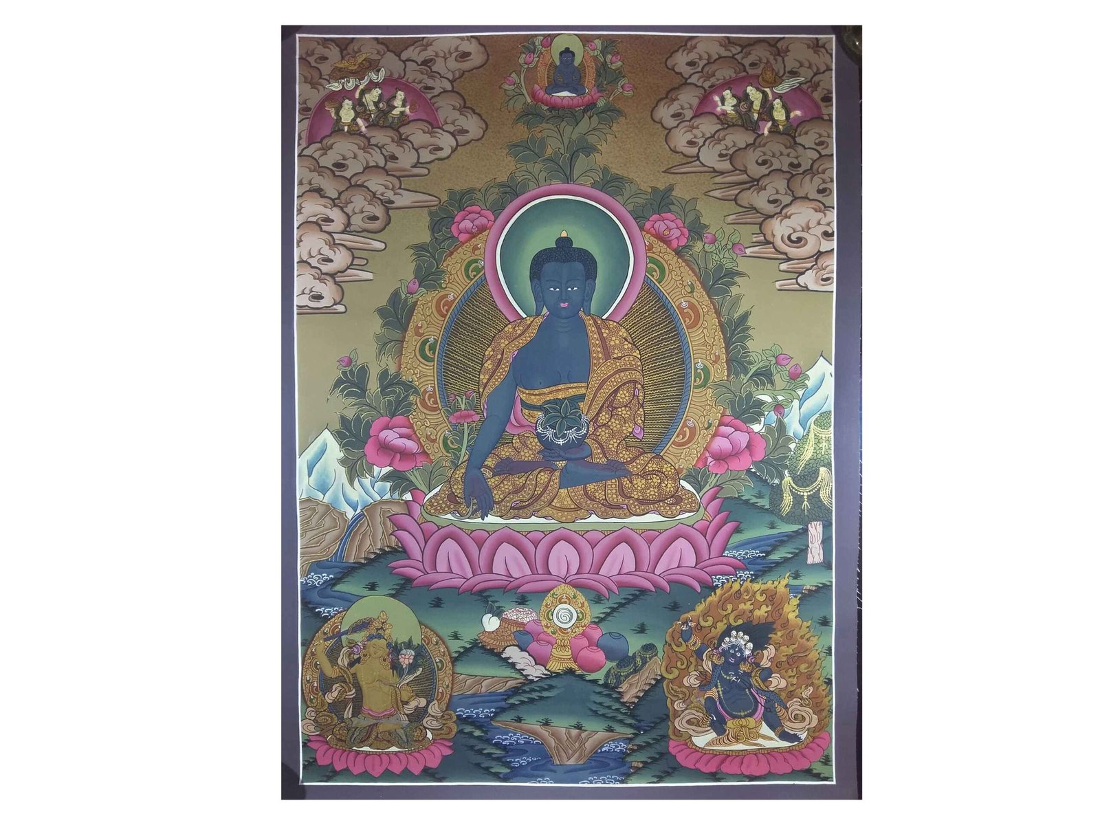 This Medicine Buddha Thangka, accompanied by depictions of Manjushri and Vajrapani, embodies the profound teachings and compassionate energy of Tibetan Buddhism, making it an exceptional piece for meditation and devotion.