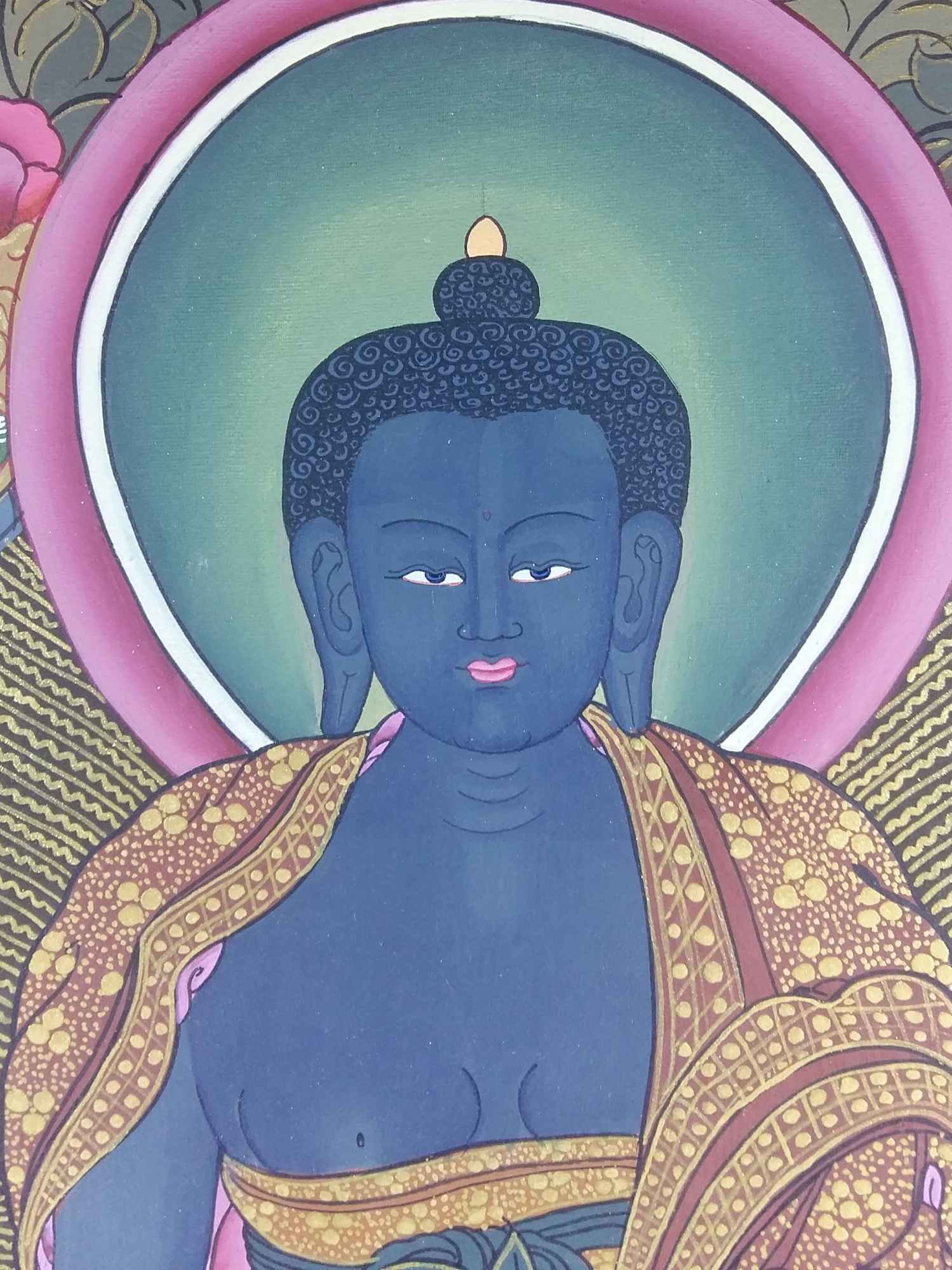 The Medicine Buddha is depicted with key attributes symbolizing his enlightened state. As a Buddha, he displays the Urna (a protuberance above the nose) and the Ushnisha (a crown-like bulge on the head), signifying his superior spiritual marks. He is adorned with a monastic robe and seated in the meditative posture with legs crossed.