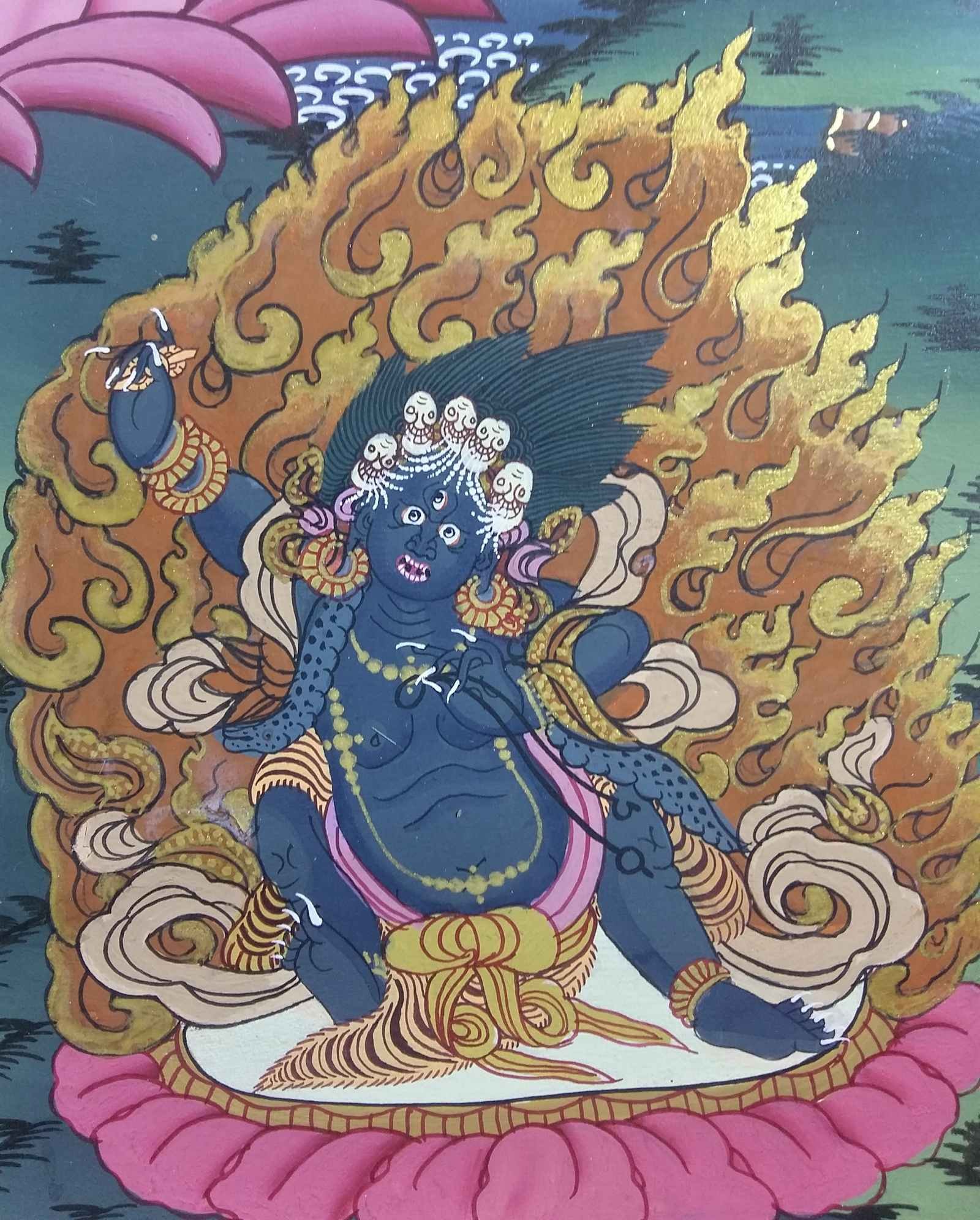 A thangka, also known as tangka, thanka, or tanka, is an exquisite form of Tibetan Buddhist art crafted on handmade cotton or silk canvas. These scroll-like paintings serve as a meditative aid and a representation of spiritual teachings, showcasing deities, mandalas, and sacred scenes with intricate details.