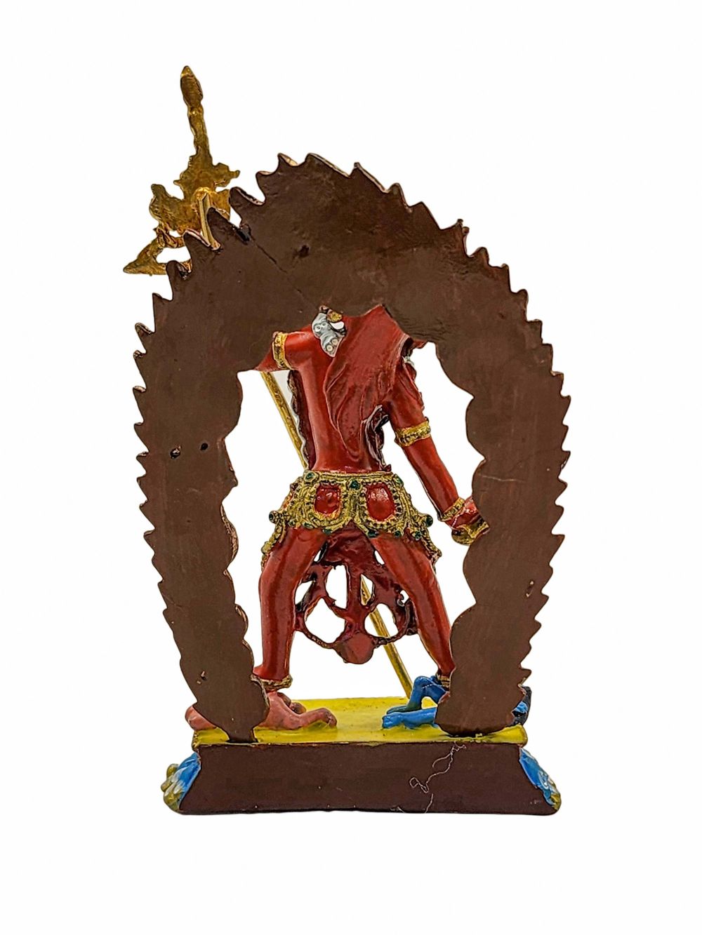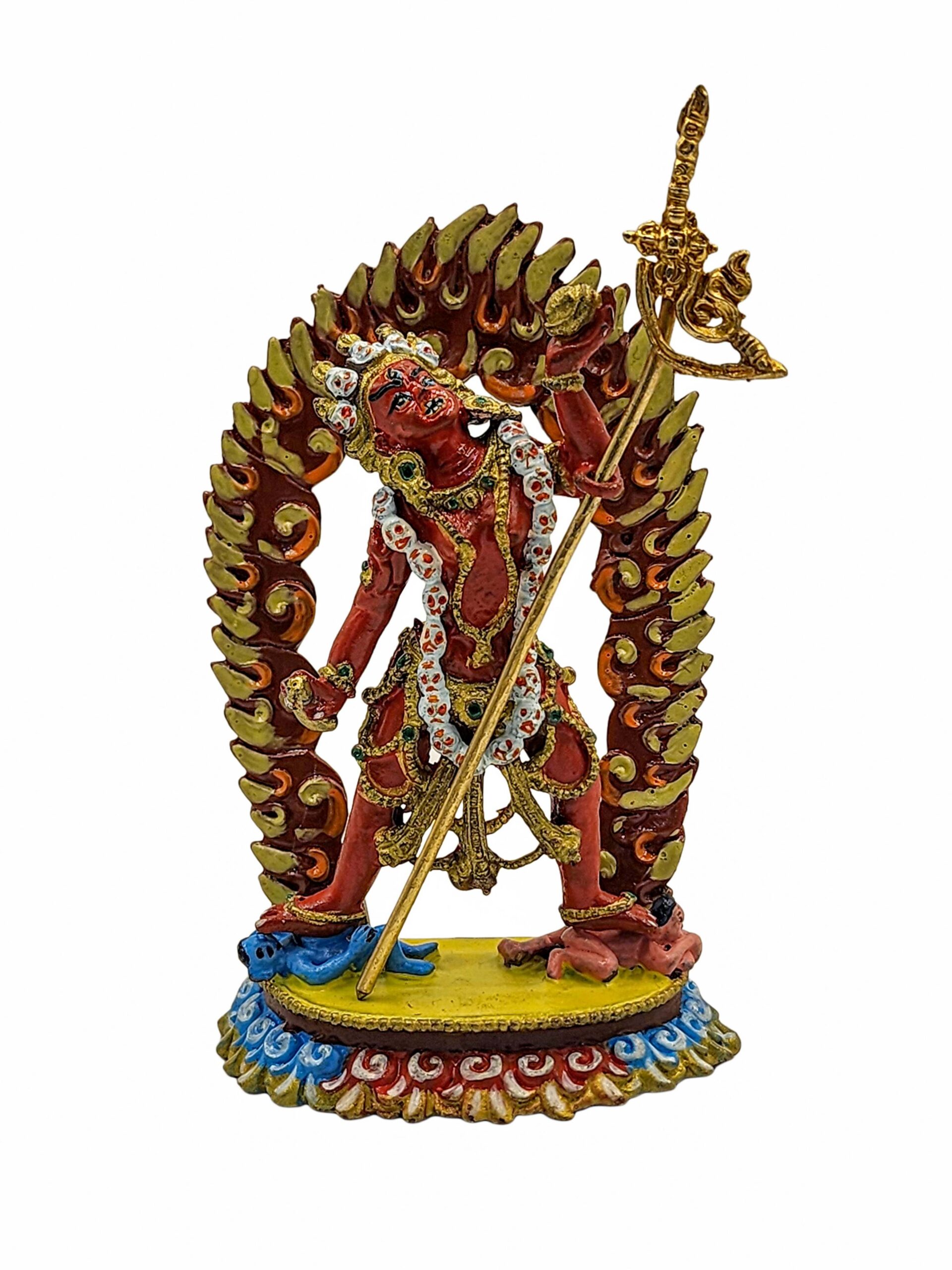 The statue features authentic traditional color finishing, combining deep reds, gold, and subtle accent tones. These colors are not merely decorative; they are essential to the symbolic identity of the deity, with red representing the fire of wisdom and transformation.