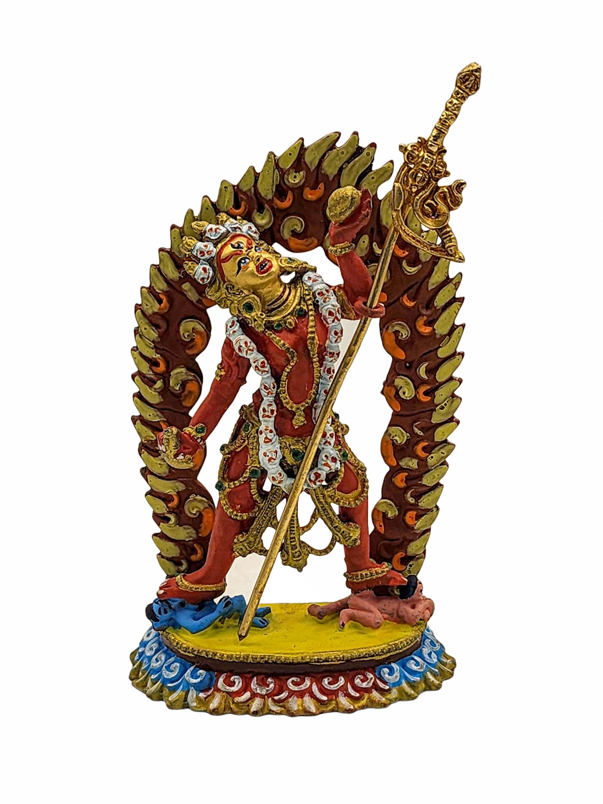 The face of Vajrayogini is delicately hand-painted, emphasizing her expressive features and spiritual depth. This step is critical in Tibetan and Nepali traditions, where the face painting ritual represents bringing the statue to life for meditation and devotion.