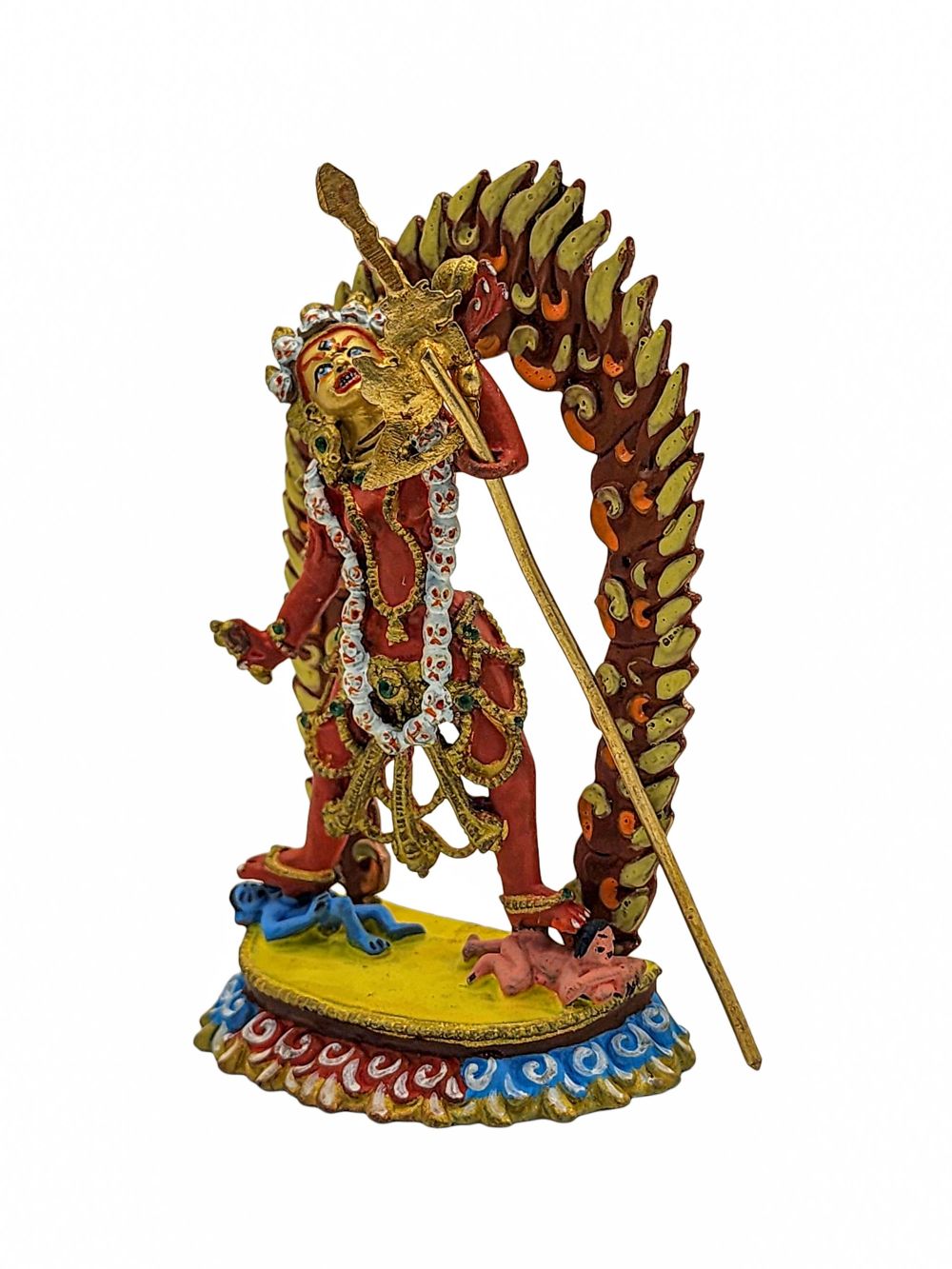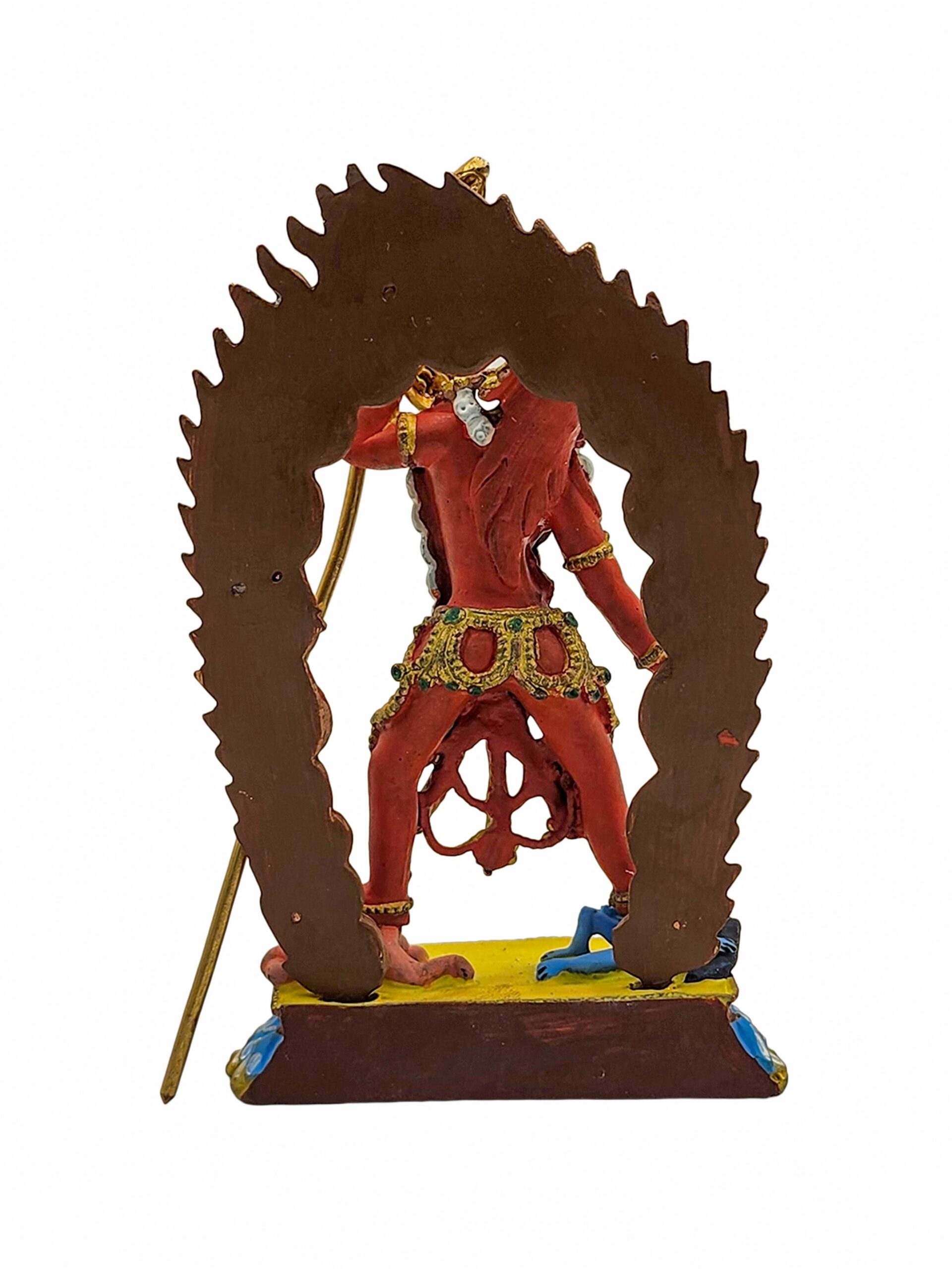 This statue of Vajrayogini is finished with traditional color detailing, following time-honored techniques that highlight her divine presence. The careful use of red, gold, and other ritual colors brings out the symbolism of each element in her form.