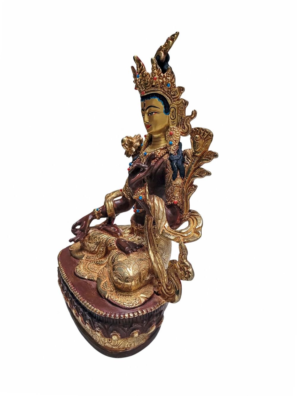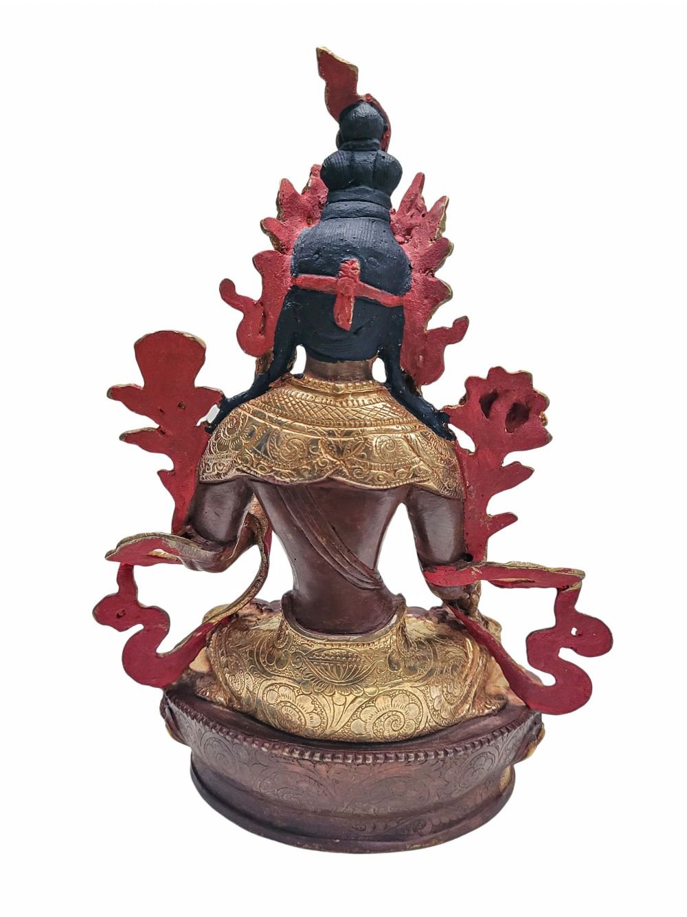 This statue features partly fire gold gilding, a traditional method practiced by skilled Nepali artisans. By applying gold to selected areas through heat fusion, the technique creates a harmonious contrast between the luminous body and the oxidized or maroon-painted robes.