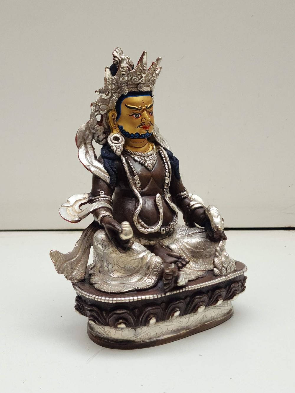 This Yellow Jambhala statue features a stunning dual-tone finish combining radiant silver plating with a rich chocolate-toned oxidation. This elegant treatment highlights the sculptural details, creating a striking contrast between shine and shadow.